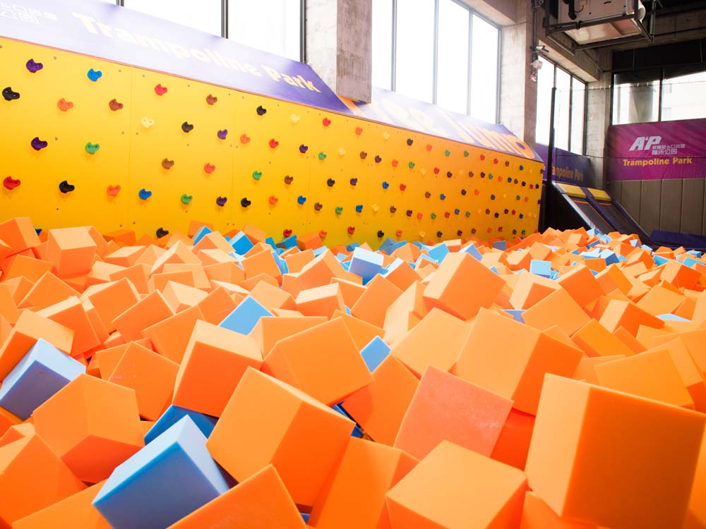 首先借助蹦面360度旋轉空翻,掉落在柔軟的海綿池里,再沿著凹凸不平的巖面往上爬,再次落到柔軟的海綿池里,還可以站在不同高度的平臺上,旋轉、跳躍,閉著眼睛,盡情享受在空中翻轉、旋轉,完成各種炫酷動作,最后落到柔軟的海綿池里,不但不危險,還很好玩,就算使出再大的力氣,也不會傷到分毫;攀巖墻還可以做彩繪圖案喔,趣味性更高。
