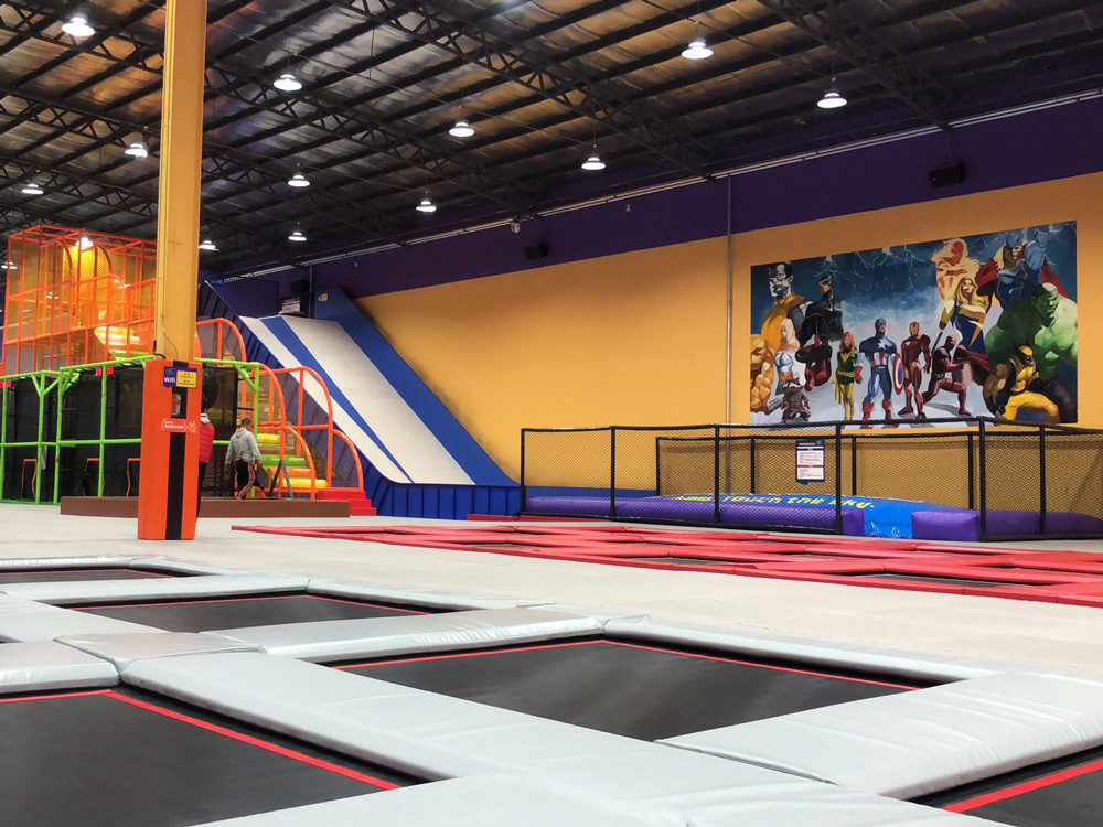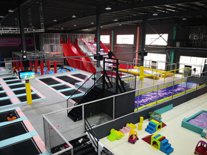 蹦床自由彈跳區:國際級彈床連接而成的彈跳空間擁有超過40張彈床,包括著名的傾斜彈床、彈跳平臺以及其他功能,測試人在空中的身體機能;